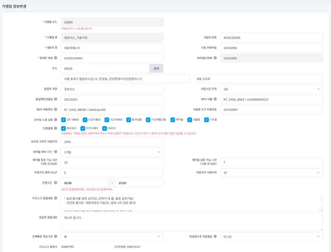휴대폰번호 : 키오스크 상태알림, 파트너센터 로그인 2차인증번호(생성된 계정에 번호가 등록되지 않은 경우)가 수신되는 번호입니다.