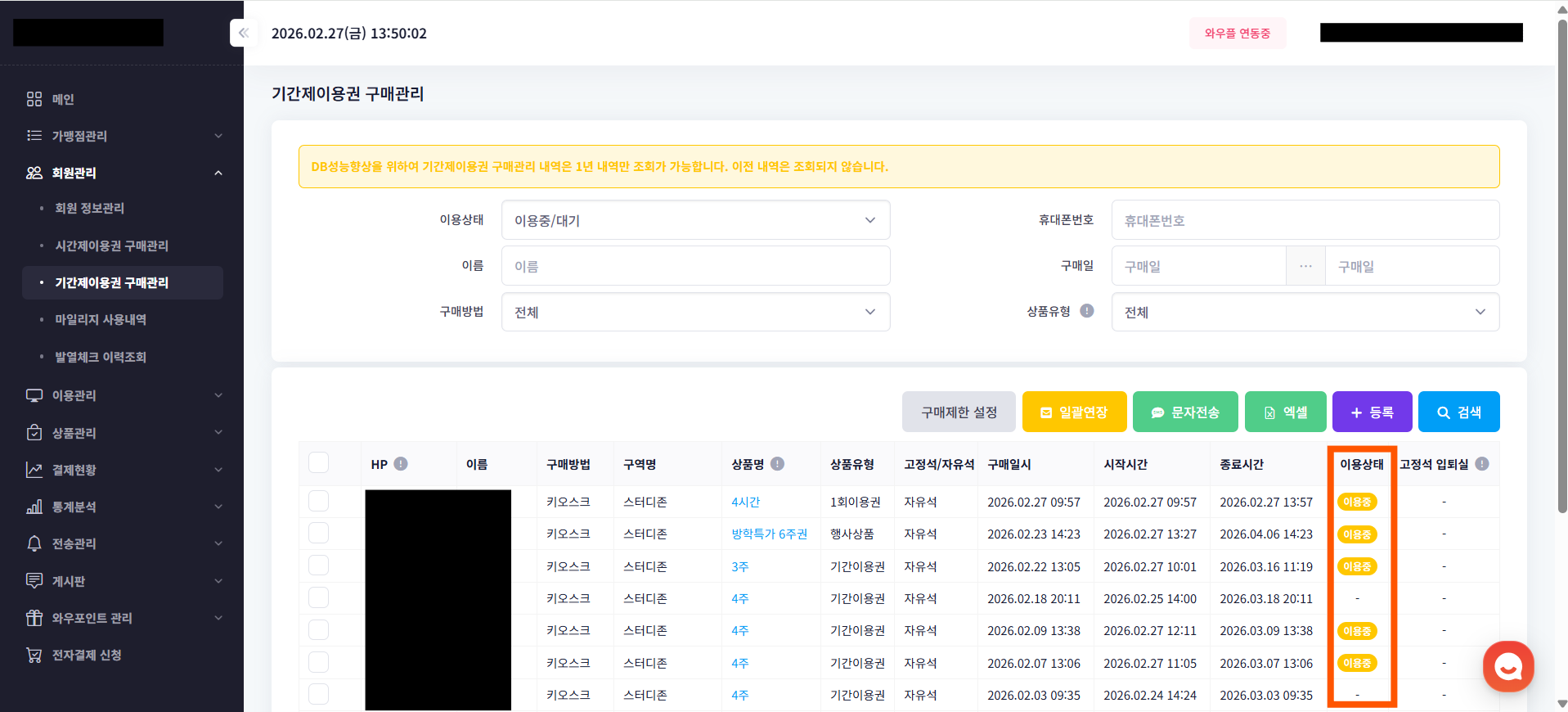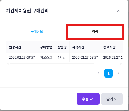 메뉴의 위치 : 파트너센터 회원관리 > 기간제이용권 구매관리