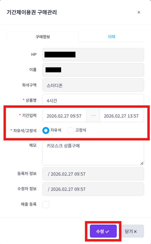 상품 이용기간(붉은 박스) 조정, 고정석/자유석 설정(파란 박스)한 후, 하단의 [수정] 버튼 클릭