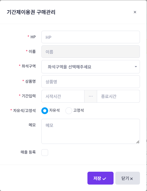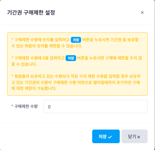 보통 기간이용권 사용자는 정해진 기간내에 무제한 이용이 가능하기 때문에 시간충전권과 달리 ‘시간차감’ 에 대한 부담이 없습니다. 따라서 기간이용권 사용자가 많으면 좌석 회전률이 떨어지므로 동시 이용할 수 있는 구매량을 제한할 수 있습니다. 설정된 수량만큼 기간제 이용권의 구매가 가능하도록 제한됩니다.