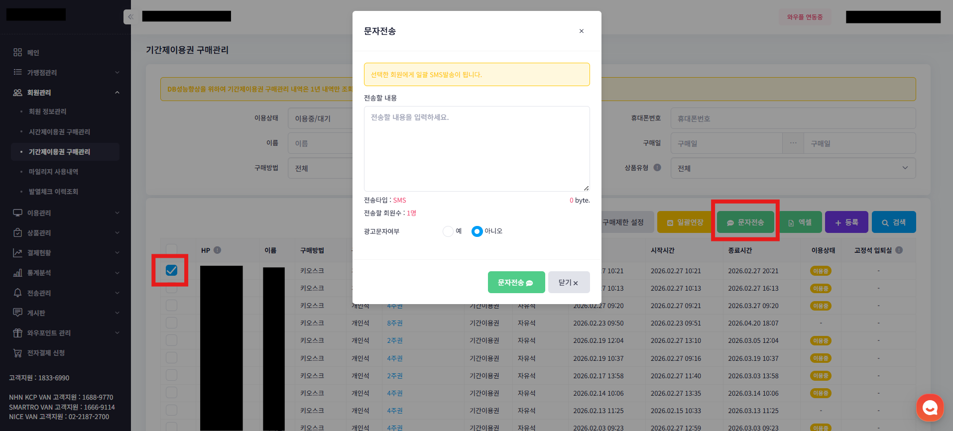 기간이용권 보유 회원을 선별하여 문자 전송 기능