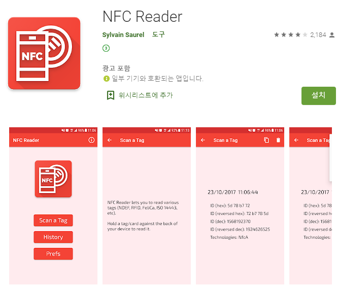 1. 구글플레이스토어 NFC Reader 앱을 설치(아이폰은 NFC기능을 지원하지 않음)