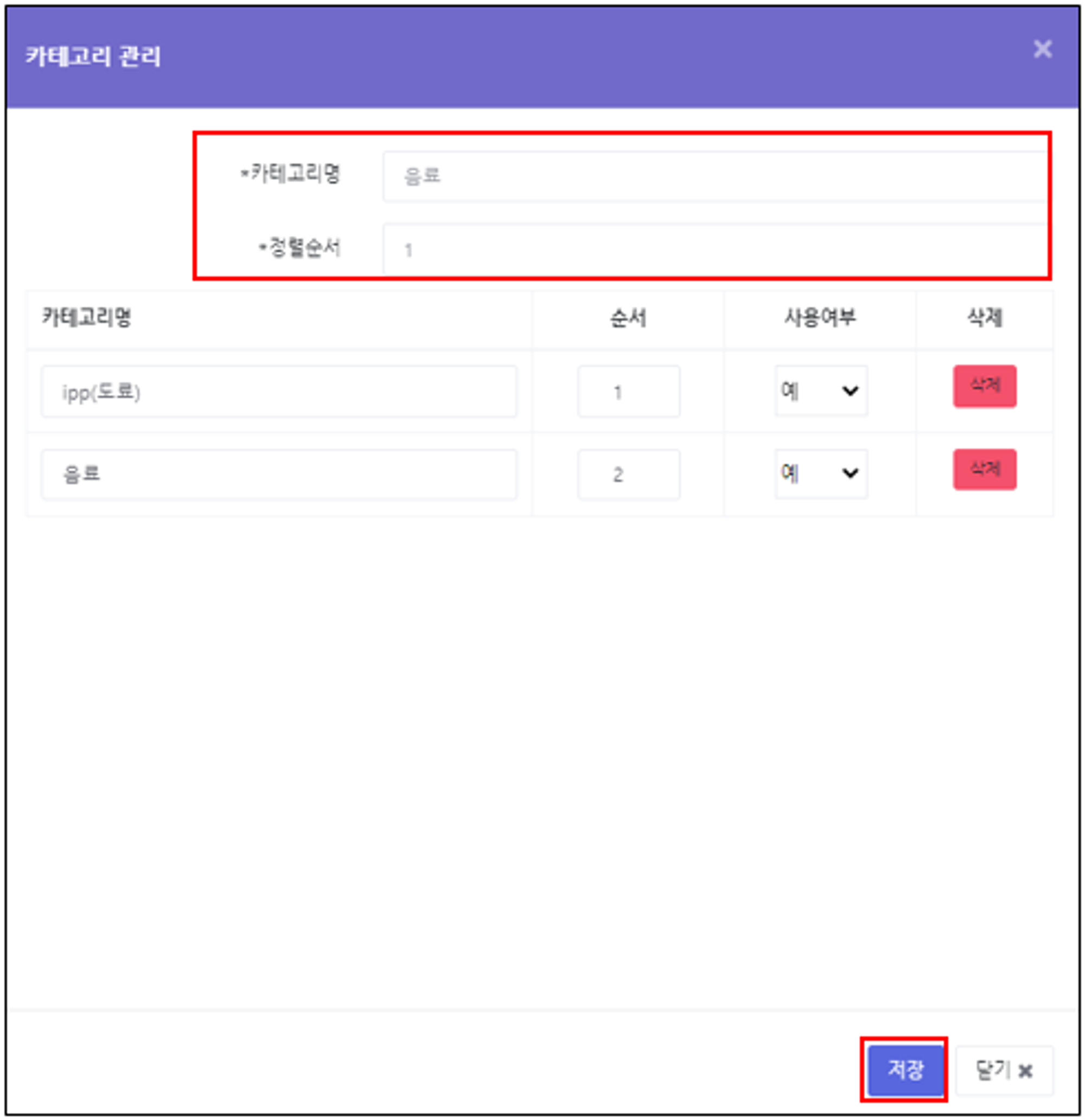 등록할 카테고리명 및 정렬순서 입력 후 [저장]버튼 클릭