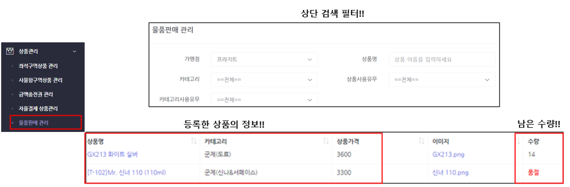 상품관리 > 물품판매 관리 에서 등록한 상품의 정보와 남은 수량을 확인할 수 있습니다.