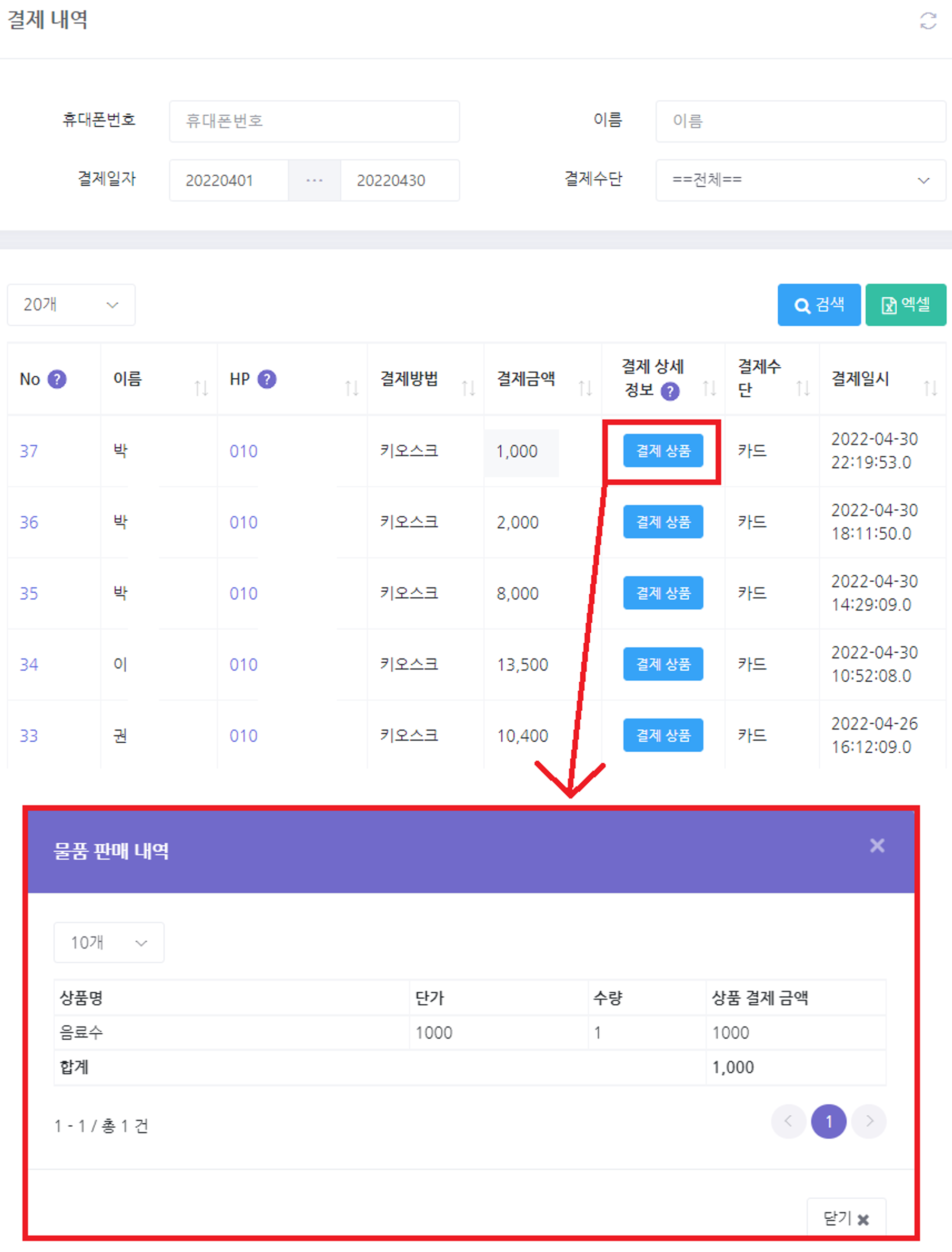 * 결제 상세정보 칼럼의 결제 상품을 클릭하게 되면 상세 판매내역을 확인 가능합니다.