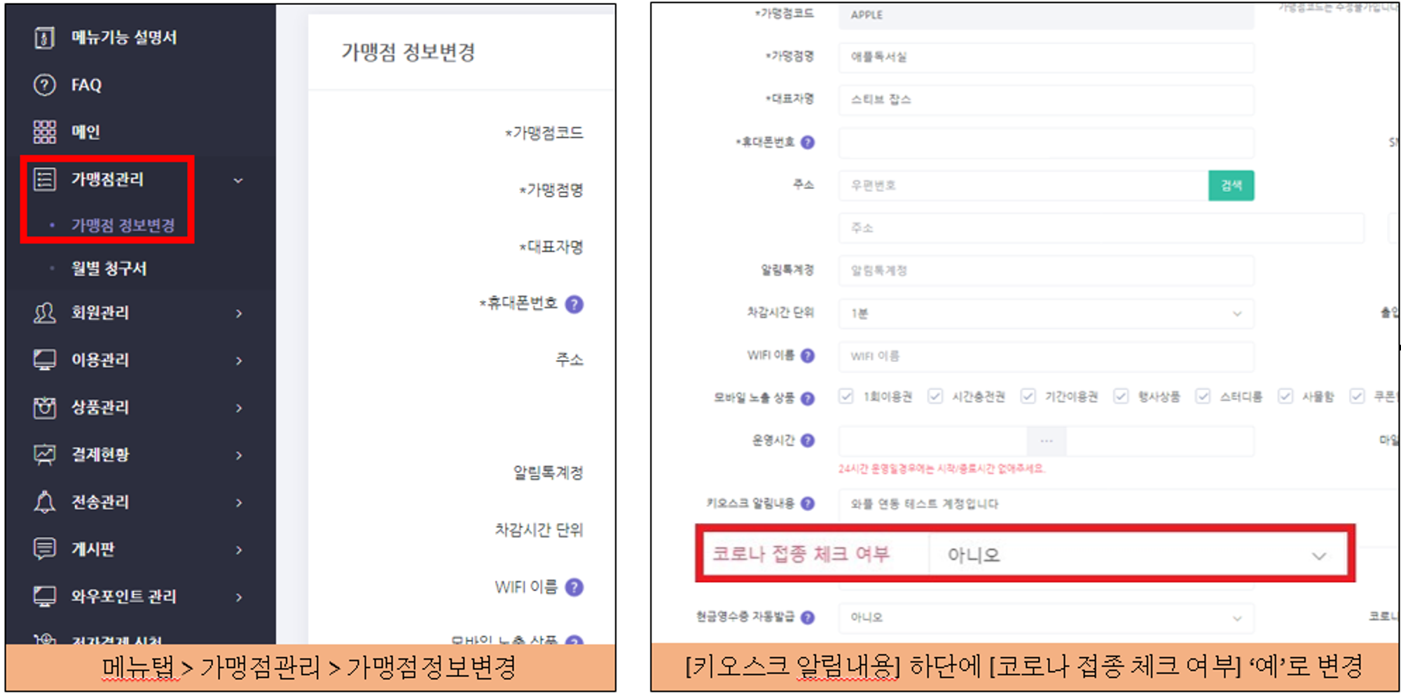 파트너센터 가맹점관리>가맹점 정보변경 메뉴의 코로나 접종 체크 여부를 '예' 적용 시 각 회원의 로그인 시 접종받은 백신정보를 입력하도록 인증 절차가 적용됩니다. ( 키오스크, 모바일앱 모두 적용)