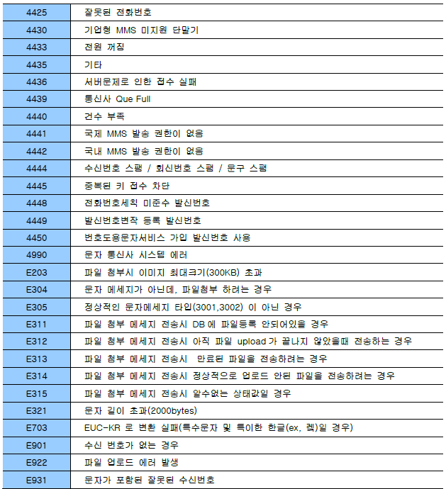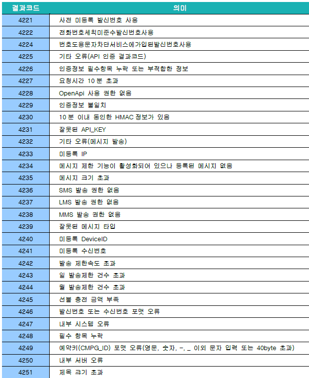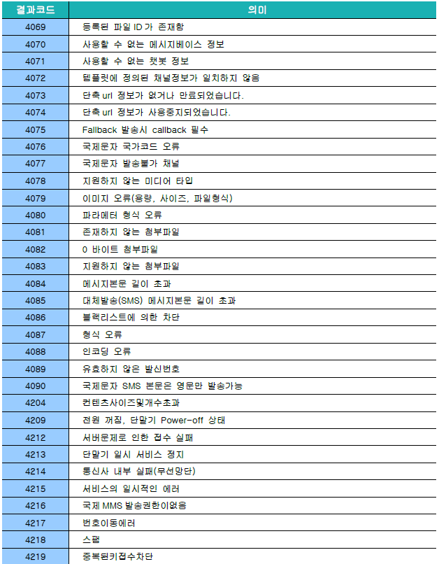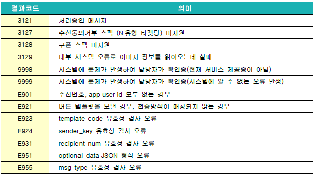 알림메시지는 다양한 이유로 전송이 실패될 수 있습니다.파트너센터 전송관리 > 알림톡/문자 발송내역 에서 전송 결과를 확인할 수 있습니다.[Agent 결과코드 Version 3.5.0]알림톡/친구톡 결과코드문자메시지 결과코드