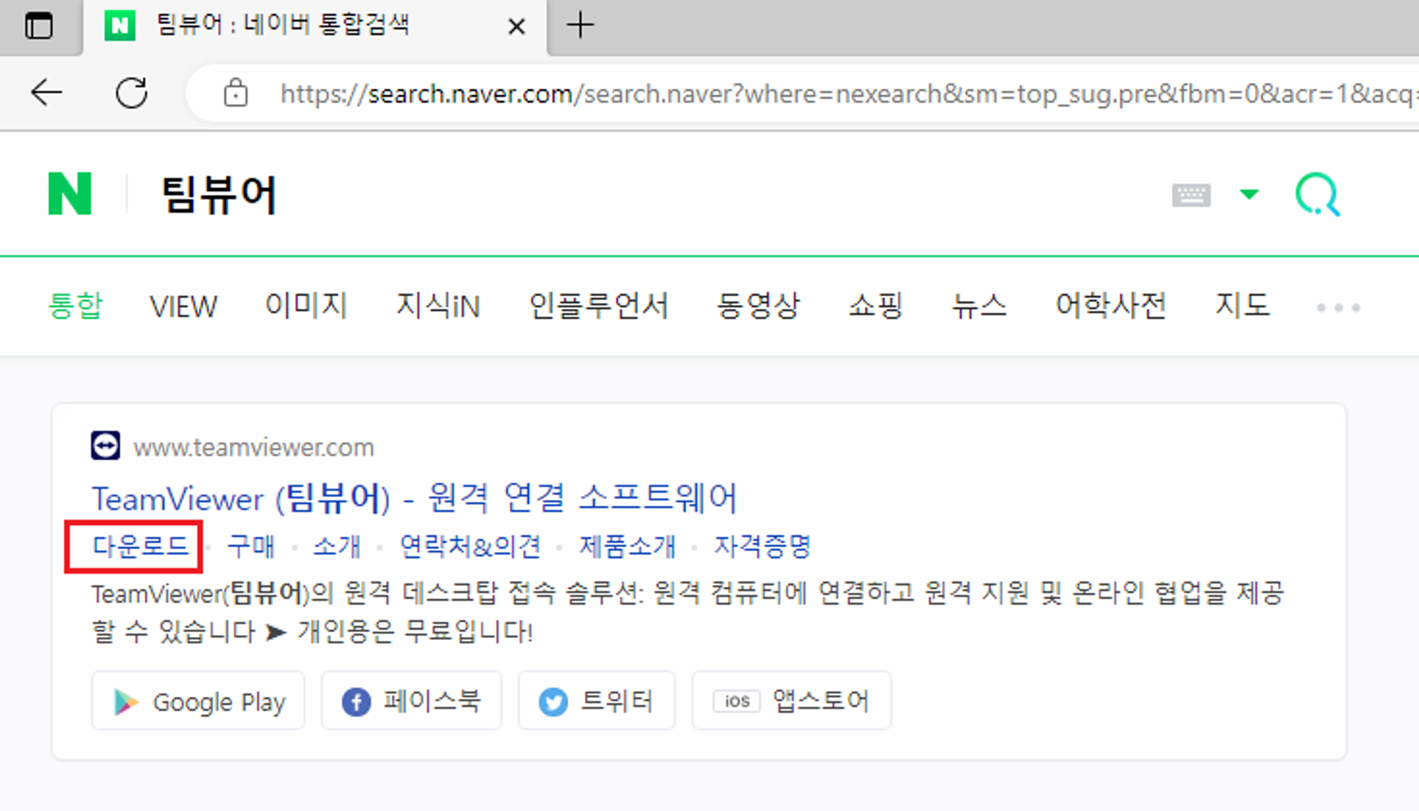 위와 같이 "팀뷰어" 검색 결과에서 “다운로드”를 터치해서 들어갑니다.