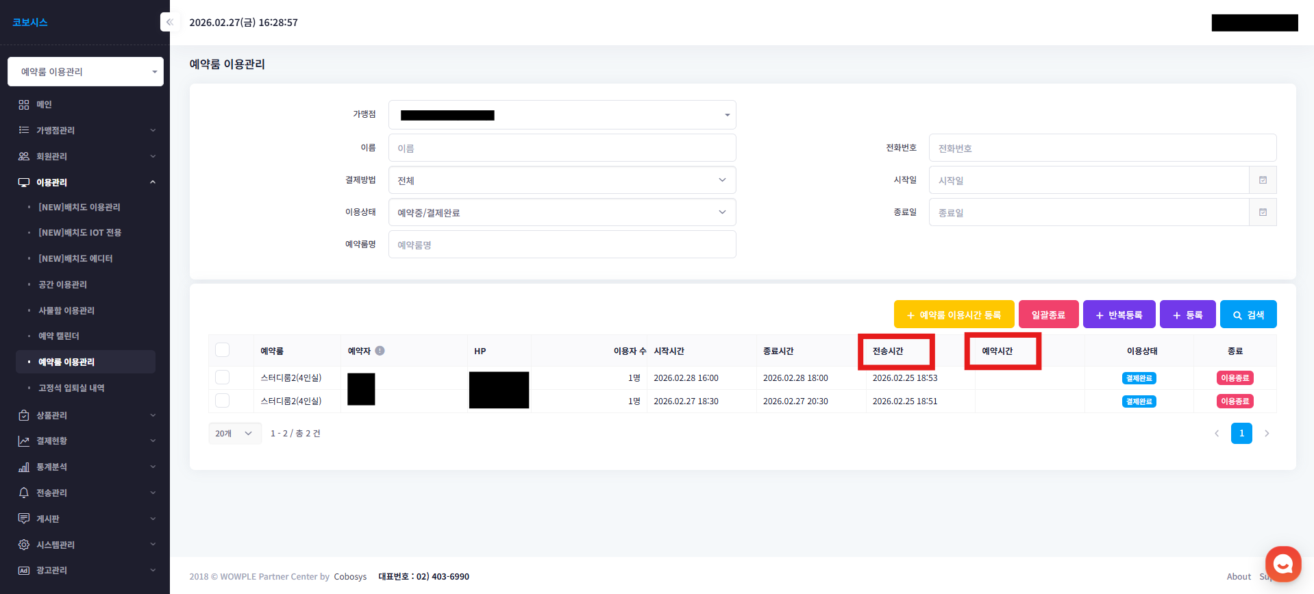 A. 예약룸 이용관리에서 해당 고객님의 예약 건을 조회 후 예약자 칼럼의 번호를 클릭하여 시작일자 시간을 변경하시면 됩니다.