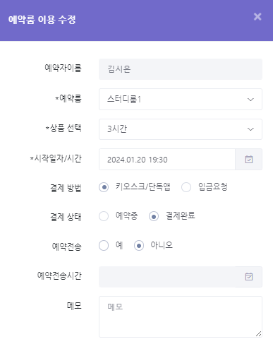 해당 상세 팝업에서 예약 건 의 결제 상태/상품을 수정할 수 있습니다.