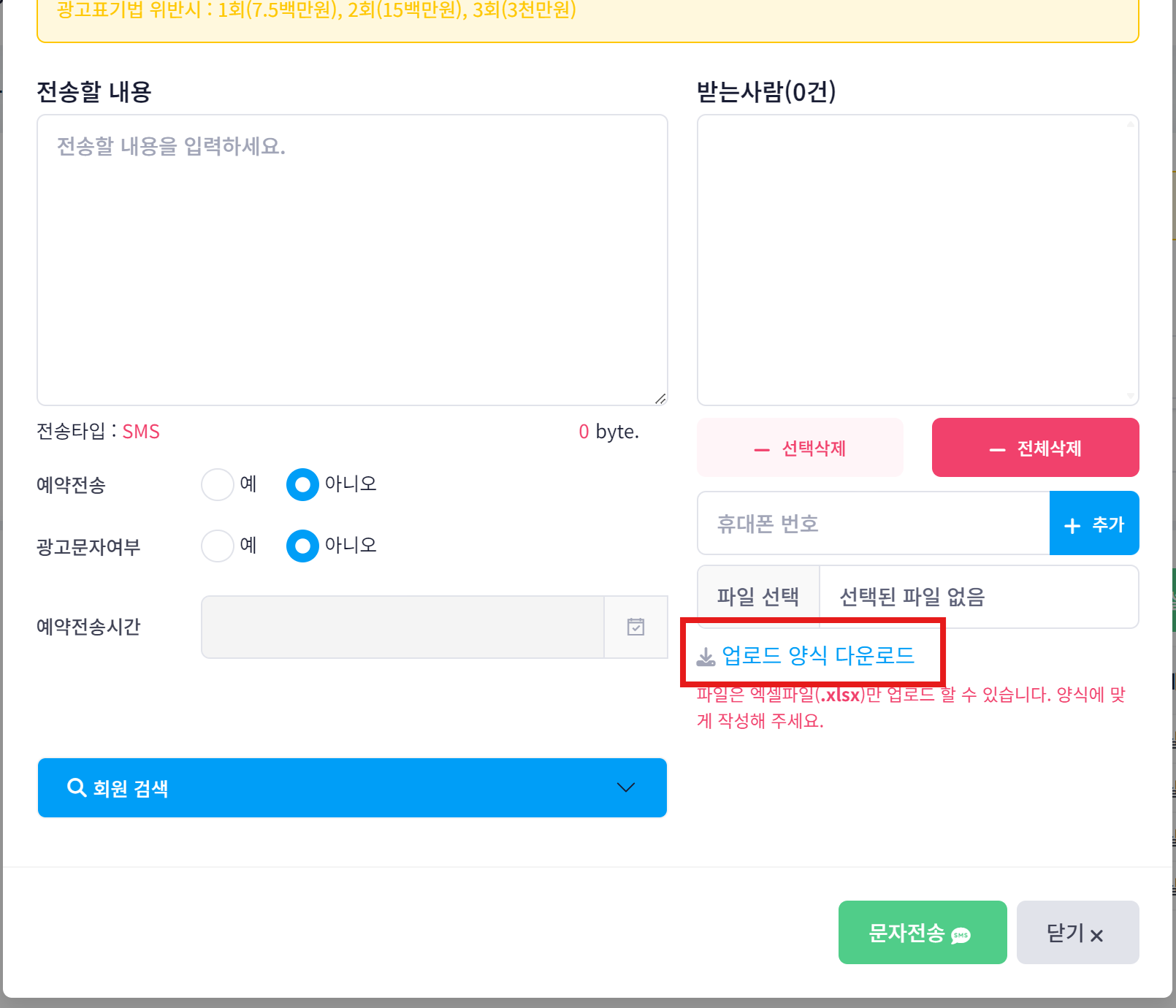 2. [문자전송] 버튼 클릭 후, 팝업 내 [업로드 양식 다운로드] 링크 클릭