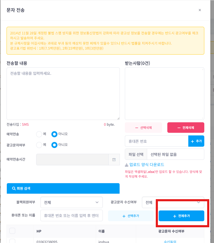 특정 회원 리스트를 정리하여 대량 메시지를 전송할 경우는 다음 문서를 확인해 주세요.