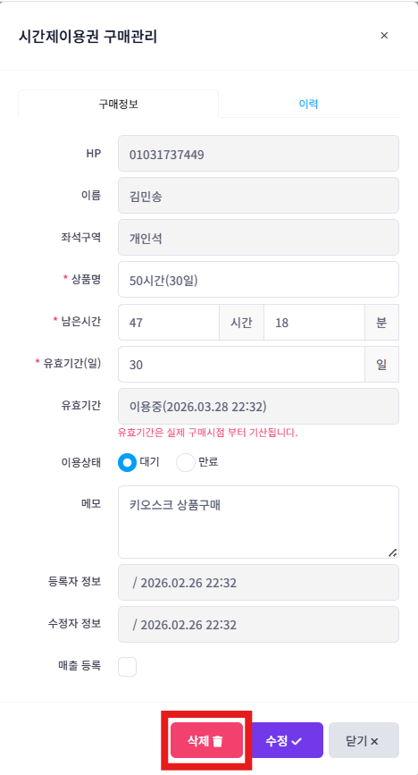 시간이용권 상품을 삭제할 경우 : 회원관리 > 시간제이용권 구매관리 접속 후, 상품명 클릭
