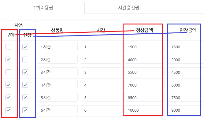 3. "구매" 사용체크는 정상금액과, "연장" 사용체크는 연장금액과 매핑이 됩니다.