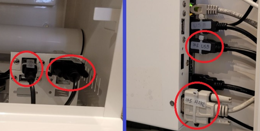 2. 듀얼아이(액정화면이 없는 리더기) : 키오스크 문을 연 후 리더기의 케이블을 앞쪽 포트 및 메인보드 포트에서 뺐다가 재연결. 해당작업 불가 시 키오스크 전원을 완전 종료 및 30초~1분 후 재부팅