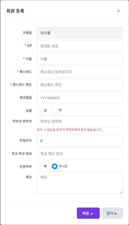 화면과 같이 필수 항목(* 표시)을 작성 후, [저장] 버튼을 클릭해 주세요.'생년월일', '성별'의 경우 매장 환경에 따라 없을 수 있습니다.