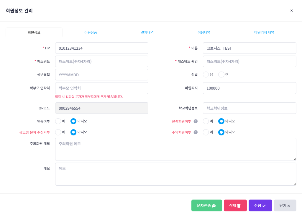 좌측 휴대폰번호 클릭 시, 회원 상세 팝업에서 해당 회원의 현재 이용상품, 결제내역, 이용내역 등을 확인할 수 있습니다.