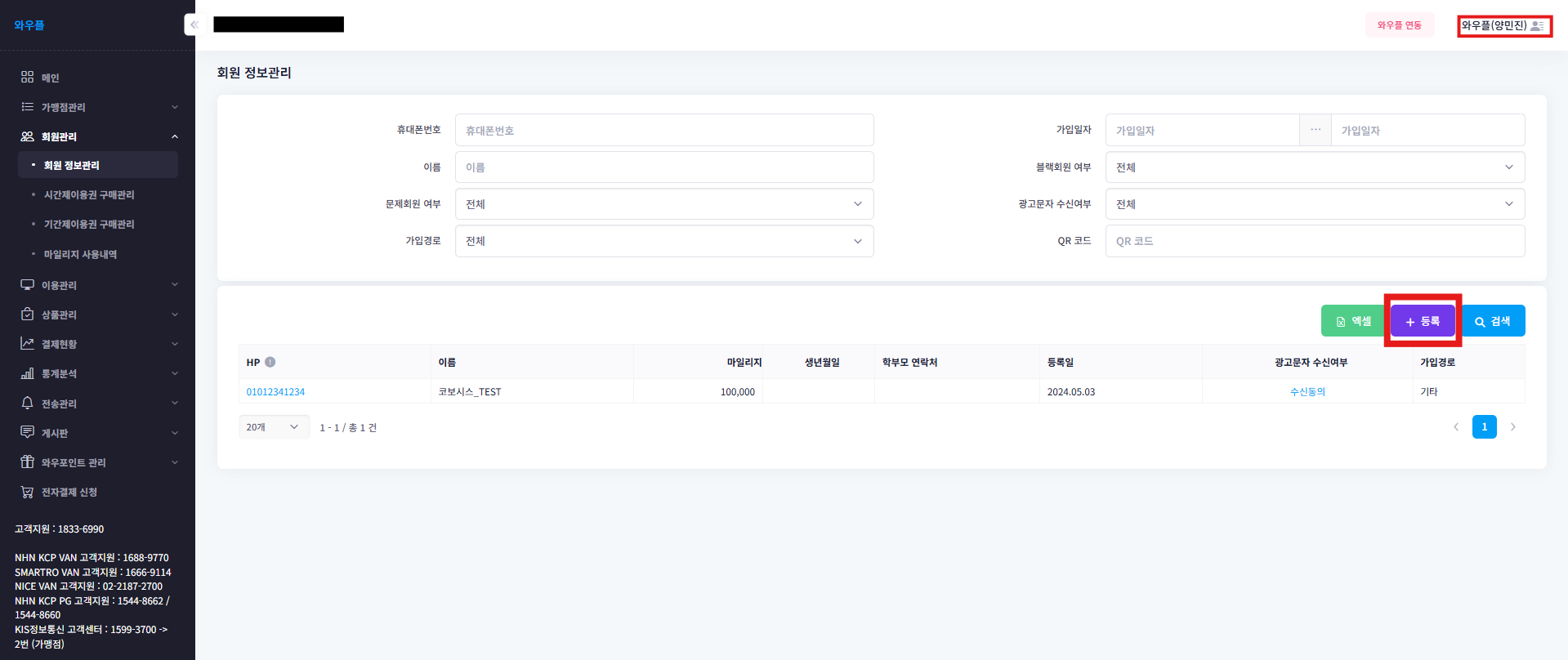 키오스크나 모바일앱을 통한 회원가입이 아닌 파트너센터에서 운영자가 직접 회원을 등록할 경우 우측 [등록] 버튼 클릭해주세요