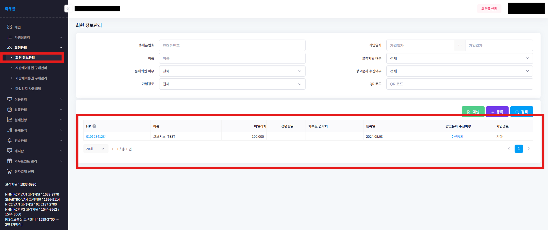키오스크 & 모바일앱 & 파트너센터를 통해 가입된 회원 리스트를 확인할 수 있습니다.