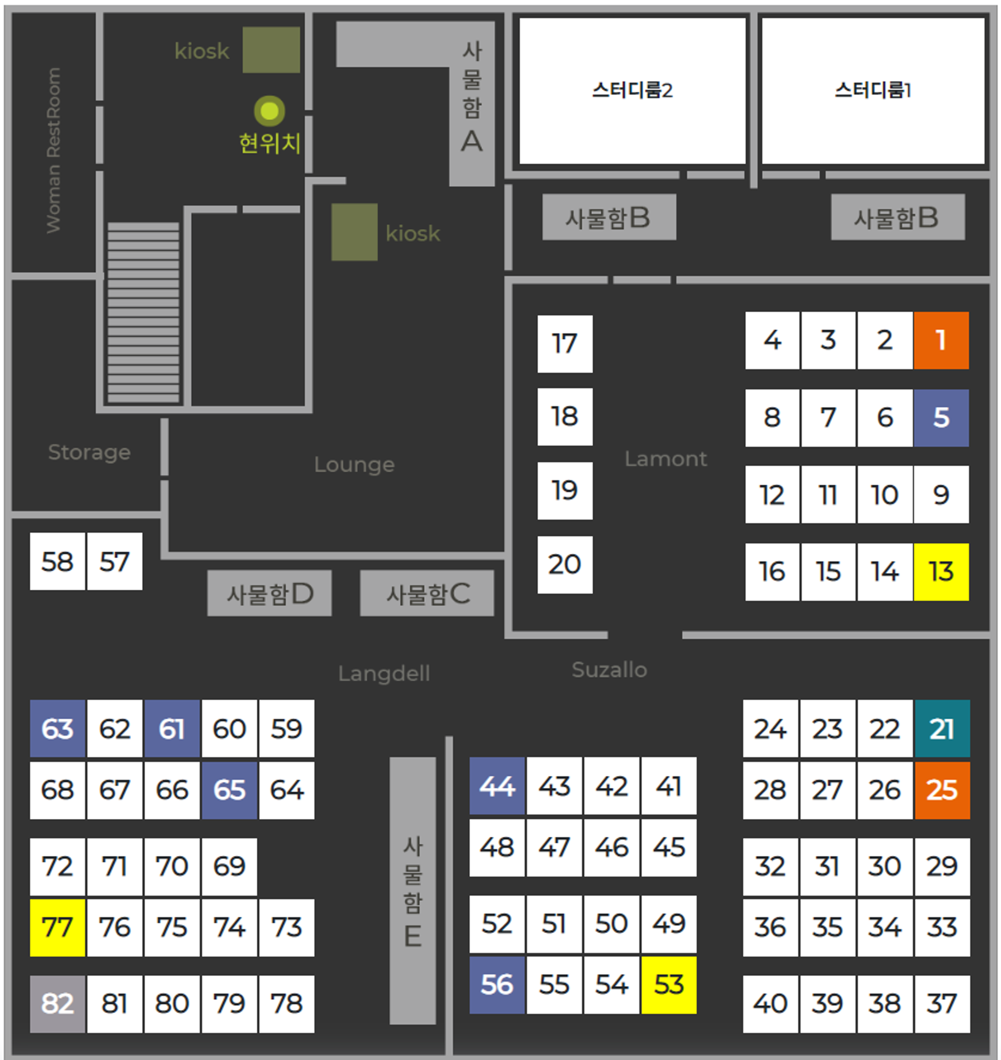 공간의 점유현황을 한눈에 파악할 수 있는 페이지이며, 상품을 가지고 있는 이용자를 관리자가 직접 공간에 배정, 기존에 이용하고 있는 이용자의 공간을 이동 및 이용종료처리 할 수 있는 페이지입니다.