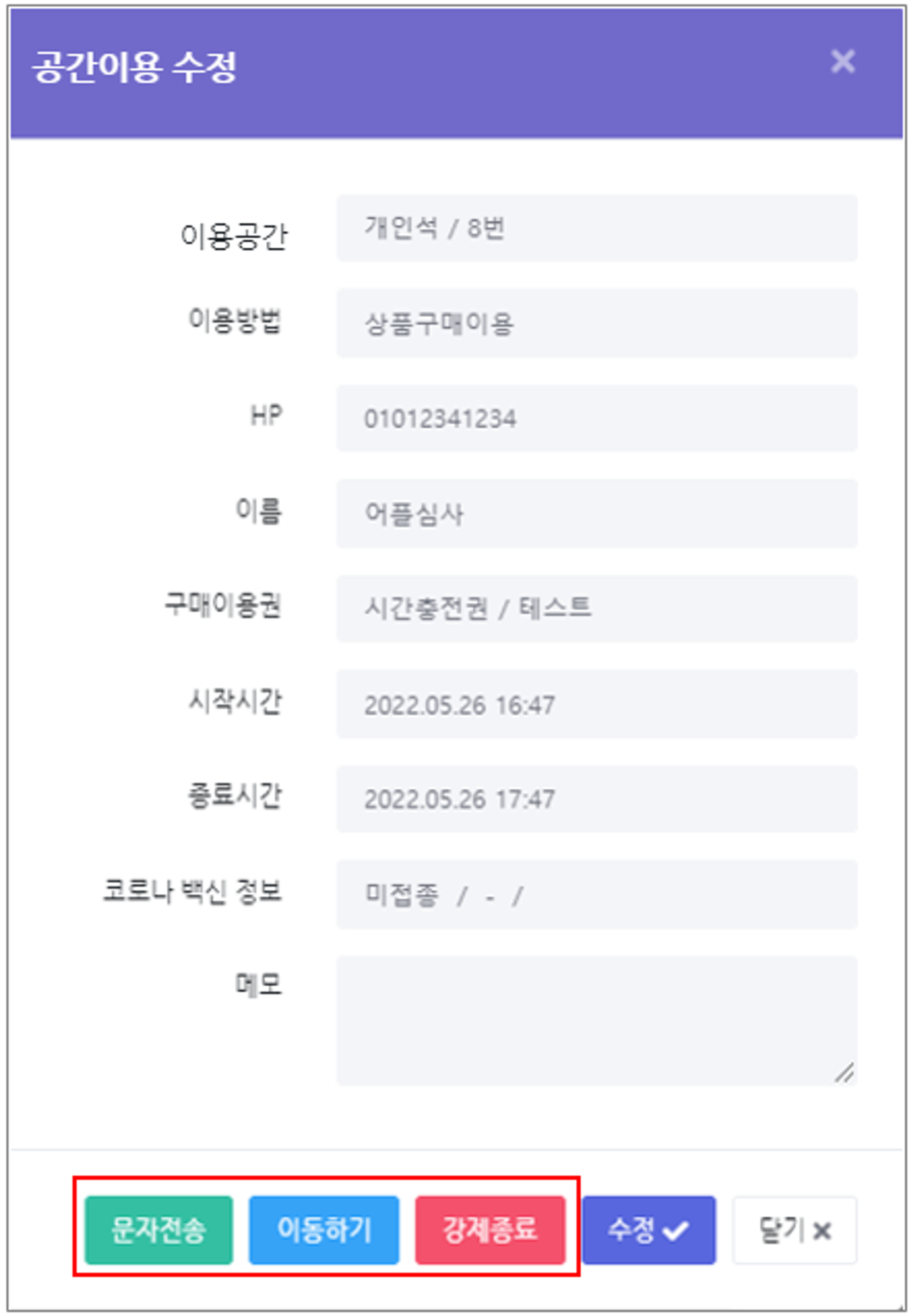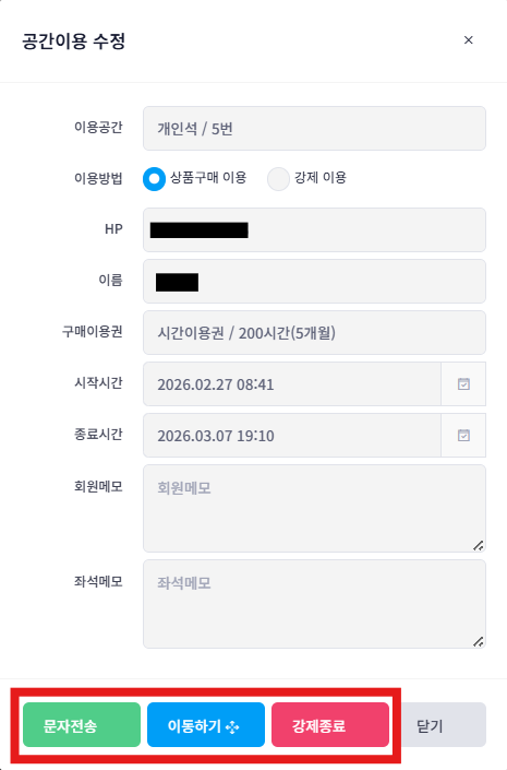문자전송 : 점유된 공간을 클릭하여 [문자전송] 버튼 클릭, 해당 공간을 점유중인 회원에게 문자 전송