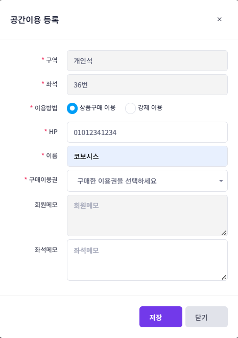 빈공간(흰색)을 클릭하여 관리자가 직접 공간을 배정할 수 있습니다. 보통 이용자가 직접 키오스크를 통해 공간을 배정받고 입장하기 때문에 잘 사용하지는 않으나 유사 시(키오스크 고장) 관리자가 직접 공간을 배정함으로써 이용자의 출입을 허용합니다.