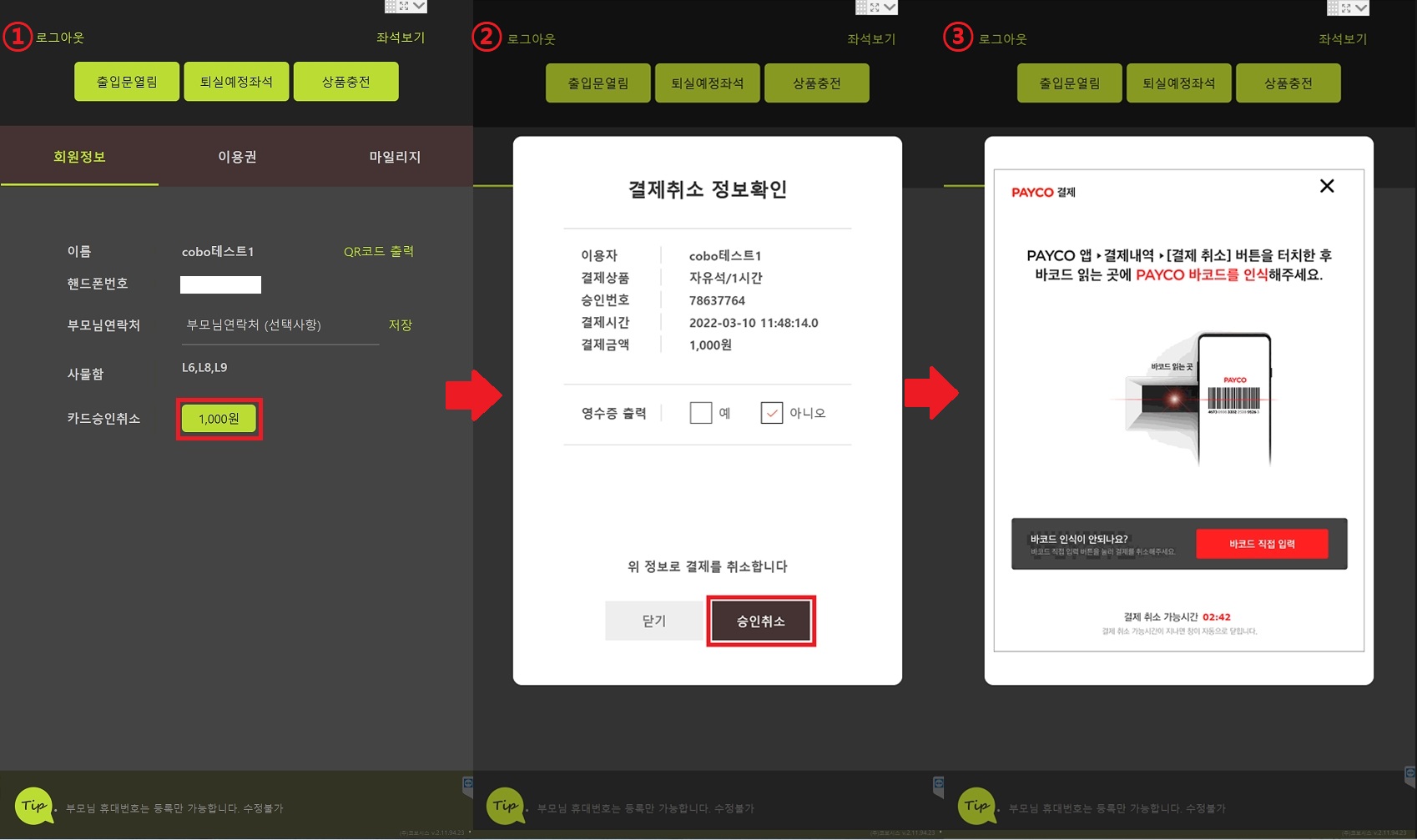 - 기존 파트너센터에서의 '현장결제 취소요청' 처리 및 이용자의 키오스크 마이페이지 접근 절차는 동일 ① '취소금액'(이미지 내 1,000원) 버튼 터치 ② KIOSK 화면 팝업 내 '승인취소' 버튼 터치 ③ KIOSK 내장 바코드리더기에 고객의 PAYCO APP 결제취소 바코드 스캔 ④ 취소 완료