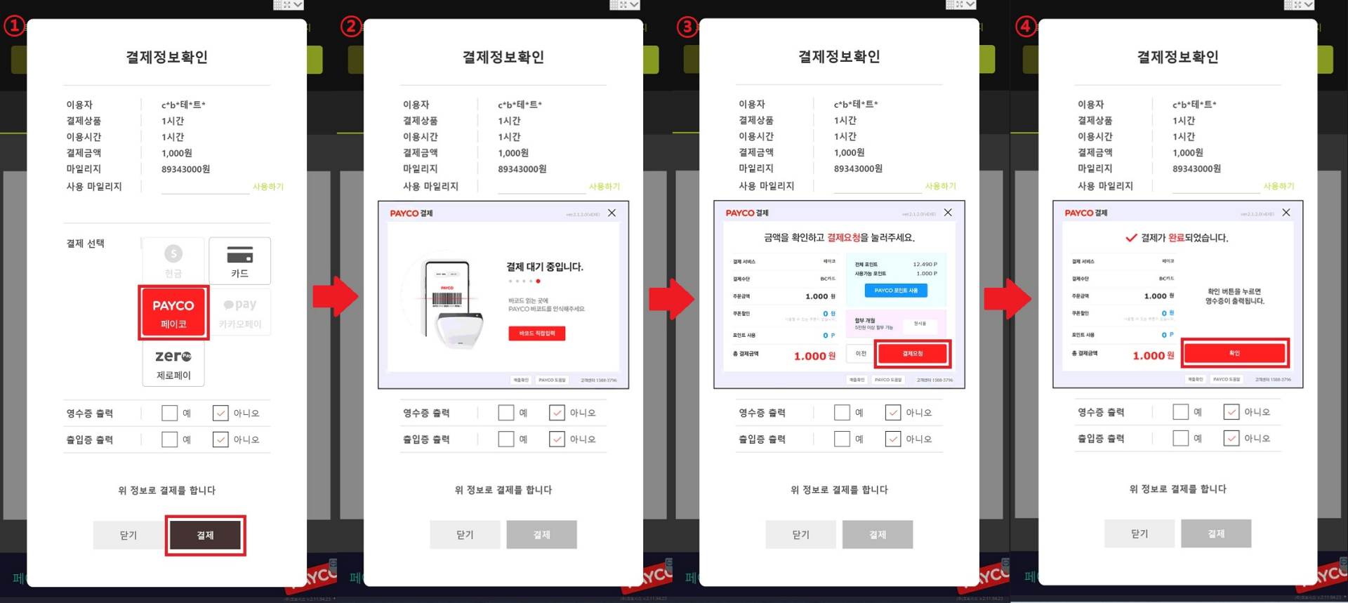 ① KIOSK 결제절차 중 '결제 선택' = PAYCO 선택 및 결제 ② KIOSK 내장 바코드리더기에 고객의 PAYCO APP 결제 바코드 스캔 ③ KIOSK 화면의 PAYCO 팝업 내 '결제요청' 버튼 터치 ④ 동일 PAYCO 팝업 내 '확인' 버튼 터치 ⑤ 결제 완료