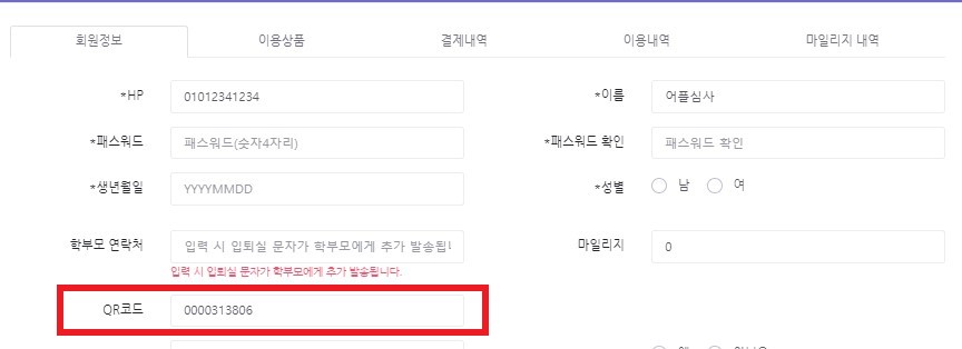 각 회원마다 고유 QR코드 10자리를 부여합니다.