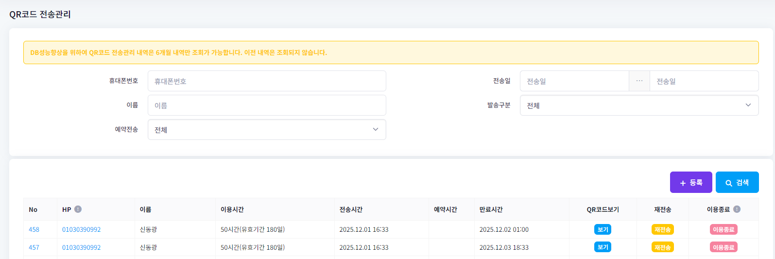 기전송된 QR이미지확인, 재전송처리, 해당 QR에 대한 이용종료 처리를 할 수 있습니다.