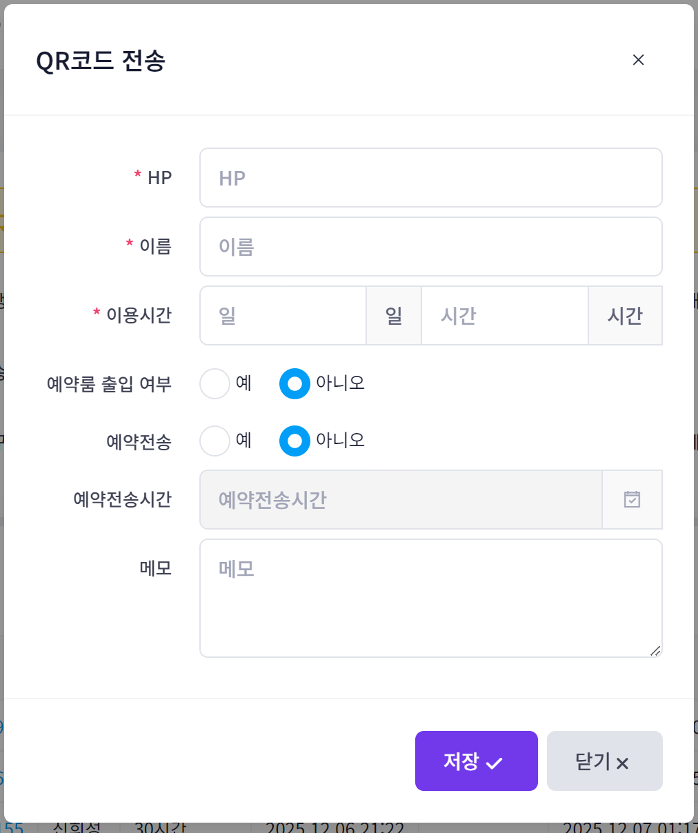 좌석 점유상태와 상관없이 출입이 가능한 QR코드를 전송할 수 있으며, 전송시점부터 이용시간까지 유효합니다. 전송시간을 미래의 시점으로 예약할 경우 전송시점부터 이용시간까지 출입이 가능합니다.